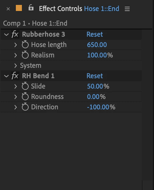 The most fundamental element of a hose is its length. This value defines the pixel distance between the controllers at which the hose will be pulled straight.
