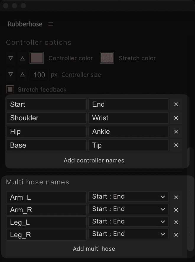 Rubberhose comes with a set of controller-pair names built in that relate to typical limb rigging for arms, legs, segments.