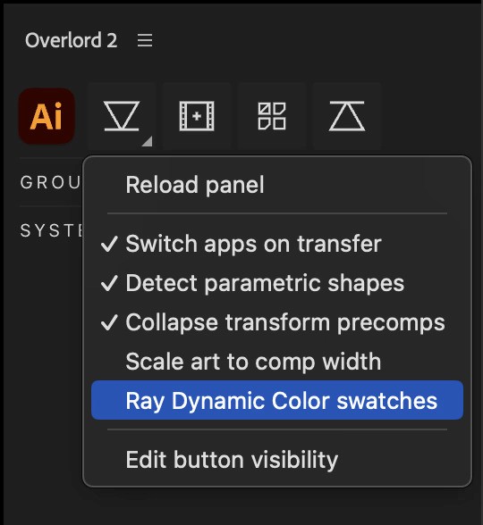 If you have Ray Dynamic Color installed, the option to use it with swatch transfer will appear in the right-click menu when the Swatches button is visible. Editing button visibility in the Overlord app.