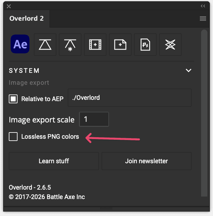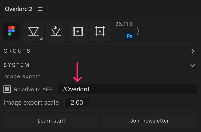 The core mechanic of Overlord is moving layer into After Effects and the first button slot is dedicated to this action. While Photoshop can have text and shape layers, it is build around image layers, so take a minute to understand how relative image paths work with your project files.