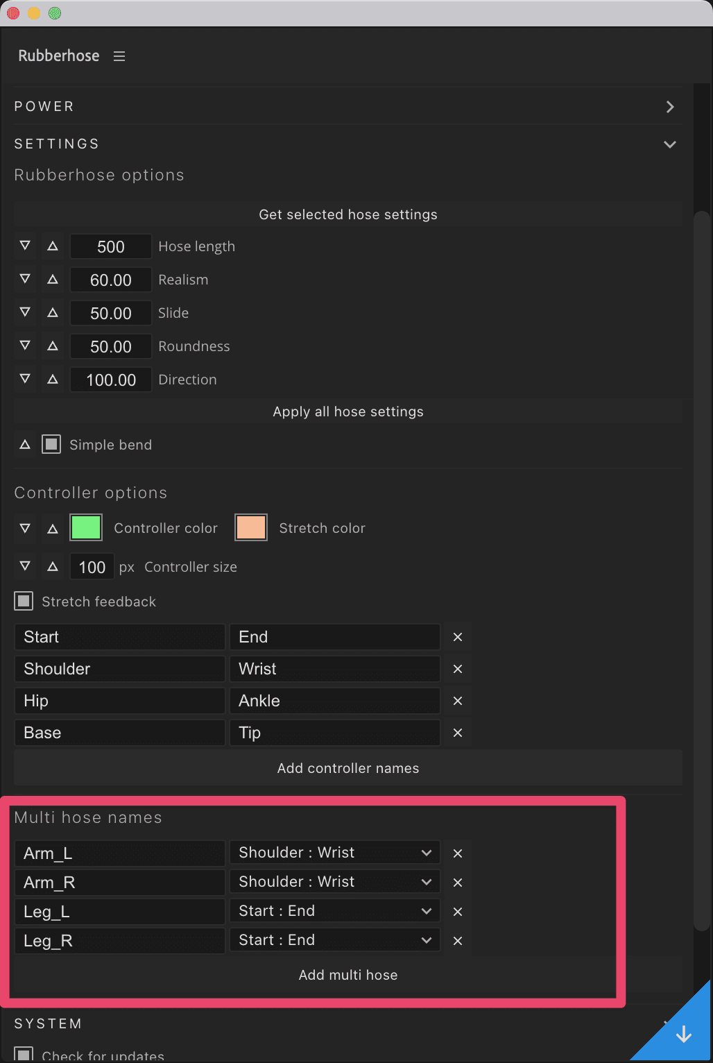 Create as many hoses as you want (4 by default), with preset names by holding SHIFT when you click New Rubberhose.